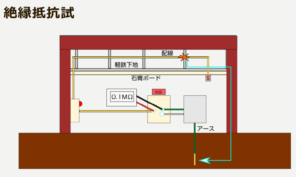余談ですが、自動火災報知設備の感知器配線回路は通常24Vから30Vの電圧がかかっています。感知器類が動くには最低でも15V程の電圧が必要です。もし絶縁が悪いと回路が15V以下になるため感知器が作動しなくなります。