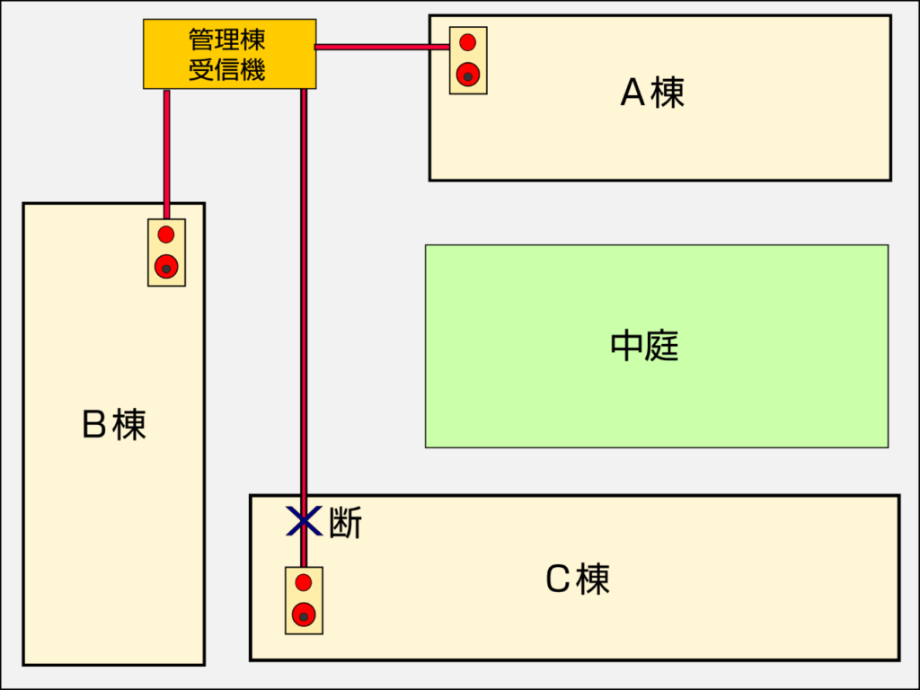 特に複数棟にまたがる大規模物件では、たった一箇所の切断で広範囲が「未警戒状態(火災を検知できない状態)」に陥ります。