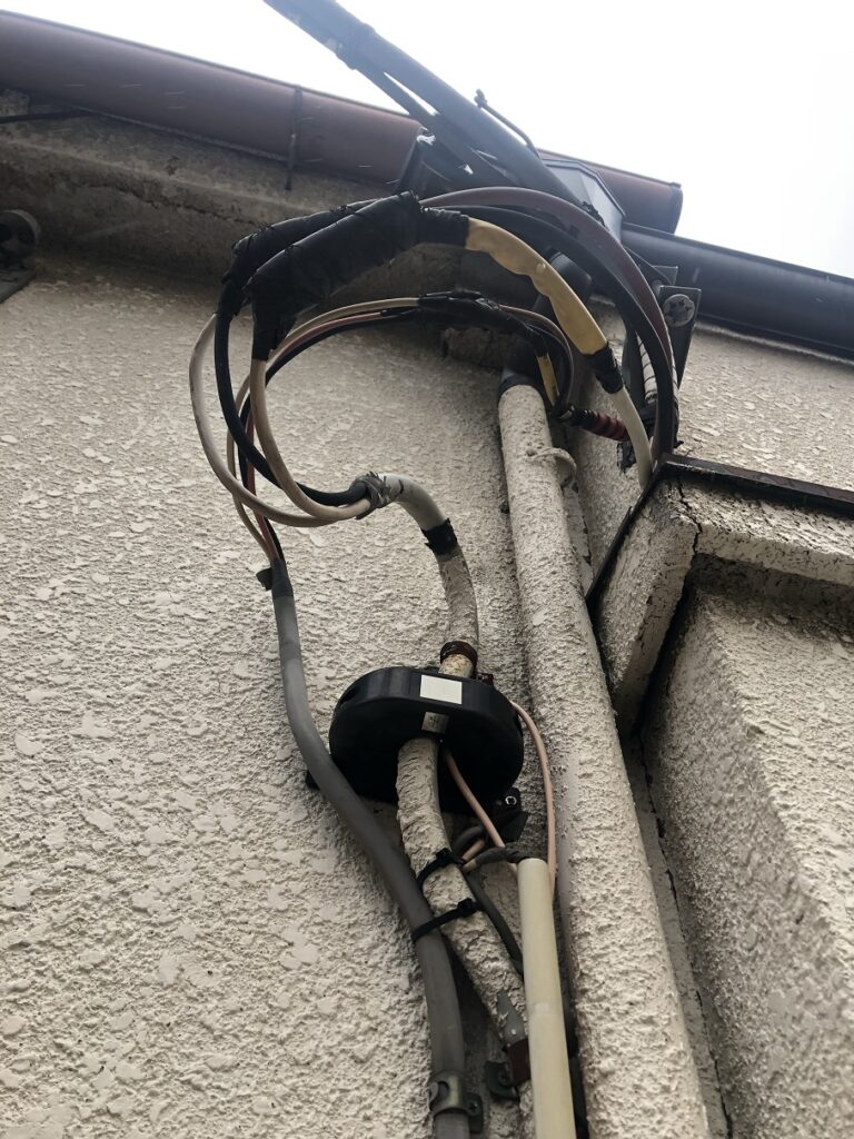 漏電火災警報機はラスモルタル造の建物に設置されています。ラスモルタル造はラス【金網】とモルタル【セメントと水を混ぜたもの】で施工されたもので、壁にモルタルを塗った時、こぼれ落ちないようにラスを設置します。