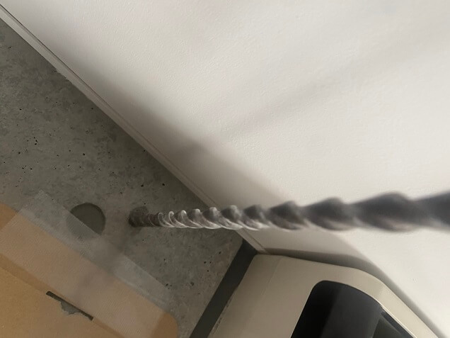場所が決まったら振動ドリルで貫通工事を行います。弊社は10.5ミリで開けることが多ので、いきなり10.5mmから開けてしまうとコンクリートがかけたり割れたりしやすくなるので、まずは小さい穴から徐々に広げていって最終的に10.5mmの穴を開けていきます。