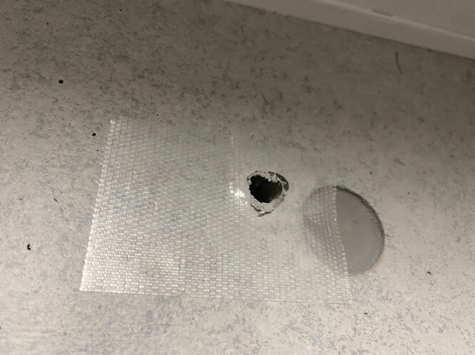 開通した10.5mmの穴です。しっかりとスキャンができていれば楽々スルスルとドリルが入っていき比較的短時間で開通します。振動ドリルは少しコツがあるので、そのコツがわかればすぐ開通します。開いた穴は耐火パテで隙間を埋めたりフィブロックを使用し防火区画処理をする必要があります。