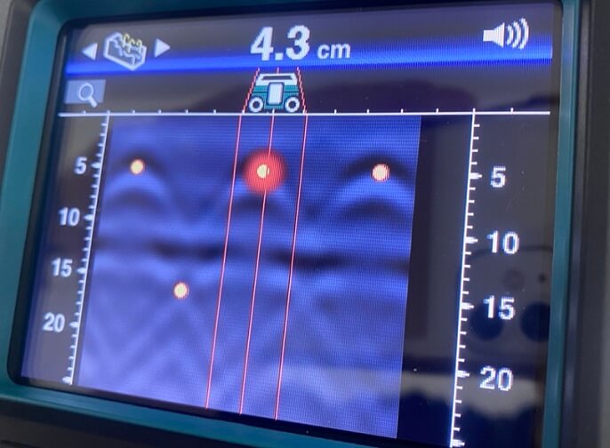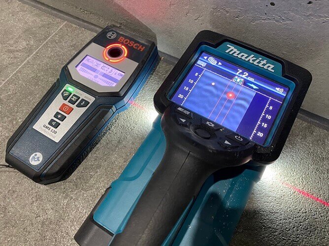 弊社では2種類の壁内埋設物センサーを使用しています。一つはマキタの製品で、多少大きいですが鉄筋の深さ180mmまで探査できます。もう一つはボッシュ製で小ぶりで深さに制限がありますが、機動性抜群の軽量タイプです。マキタが使えない場所の探査で重宝しています。