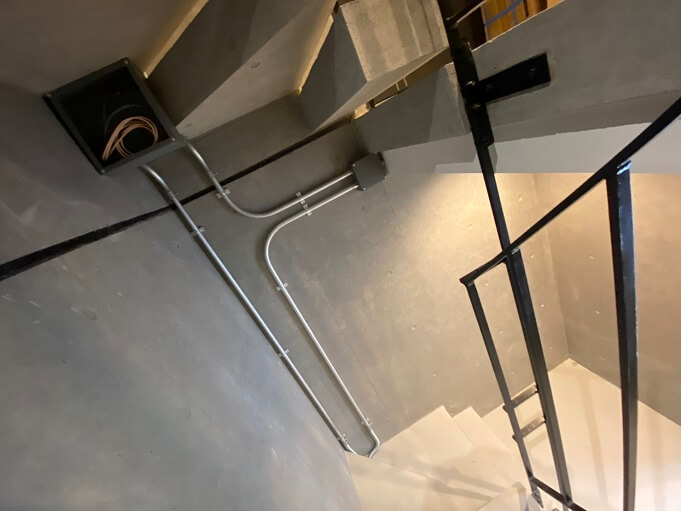 今回のプロジェクトでは、うちっぱなし鉄筋コンクリート物件であることを考慮し、オーナー様との相談の上で金属管を採用しました。金属管は打ちっぱなしコンクリートとの相性が非常に良く、デザインのアクセントとしても機能します。