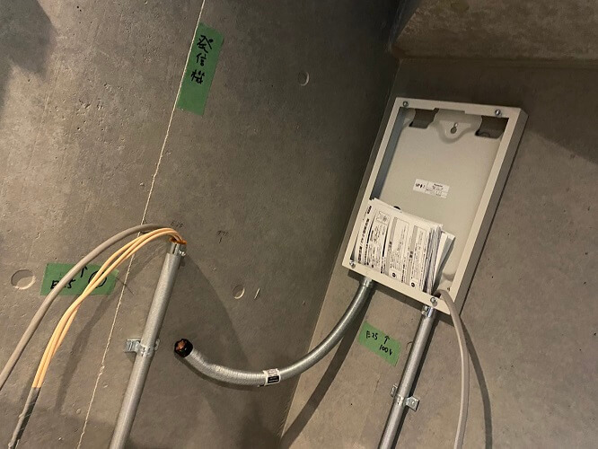 もし将来的に配線を引き換えることが必要になってもアウトレットボックスを設けているので比較的容易に改修等の作業を行うことができます。メンテナンスも考慮して施工していきます。