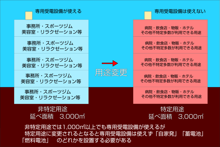 現在非特定用途で使用している3,000㎡の建物があったとします。事務所やスポーツジムなののテナントが退去し、空きテナントに病院、飲食店、物販、ホテルなどの不特定多数が利用できるできる用途が入ったときは、建物の用途が特定用途に変わるため非常電源専用受電設備が使えなくなります。