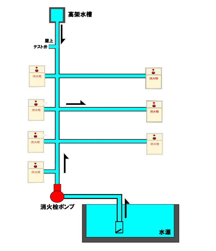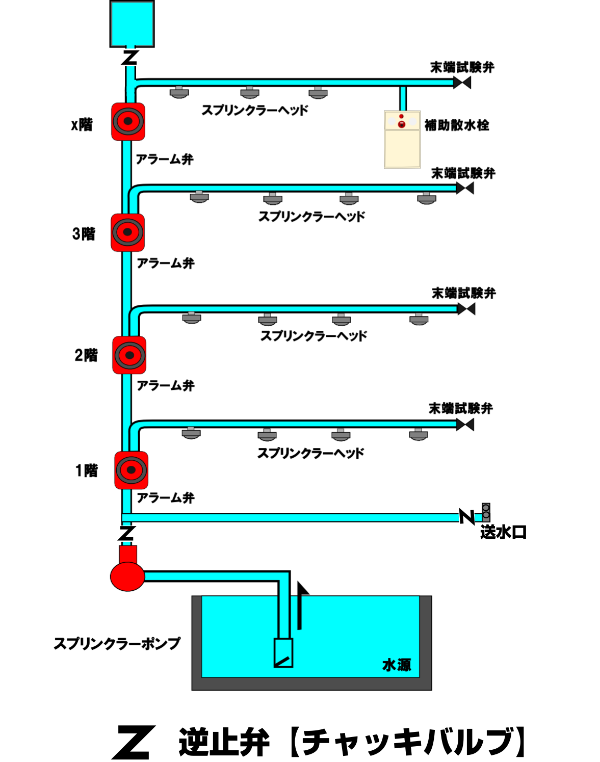 補助散水栓はスプリンクラー配管を共有しているためスプリンクラー用ポンプにを使用し、屋内消火栓は屋内消火栓ポンプを使用します。系統図を書いてみました。まずスプリンクラーから説明します。一番上の階の末端にある消火栓箱のような装置が補助散水栓です。外形的には消火栓と変わりません。