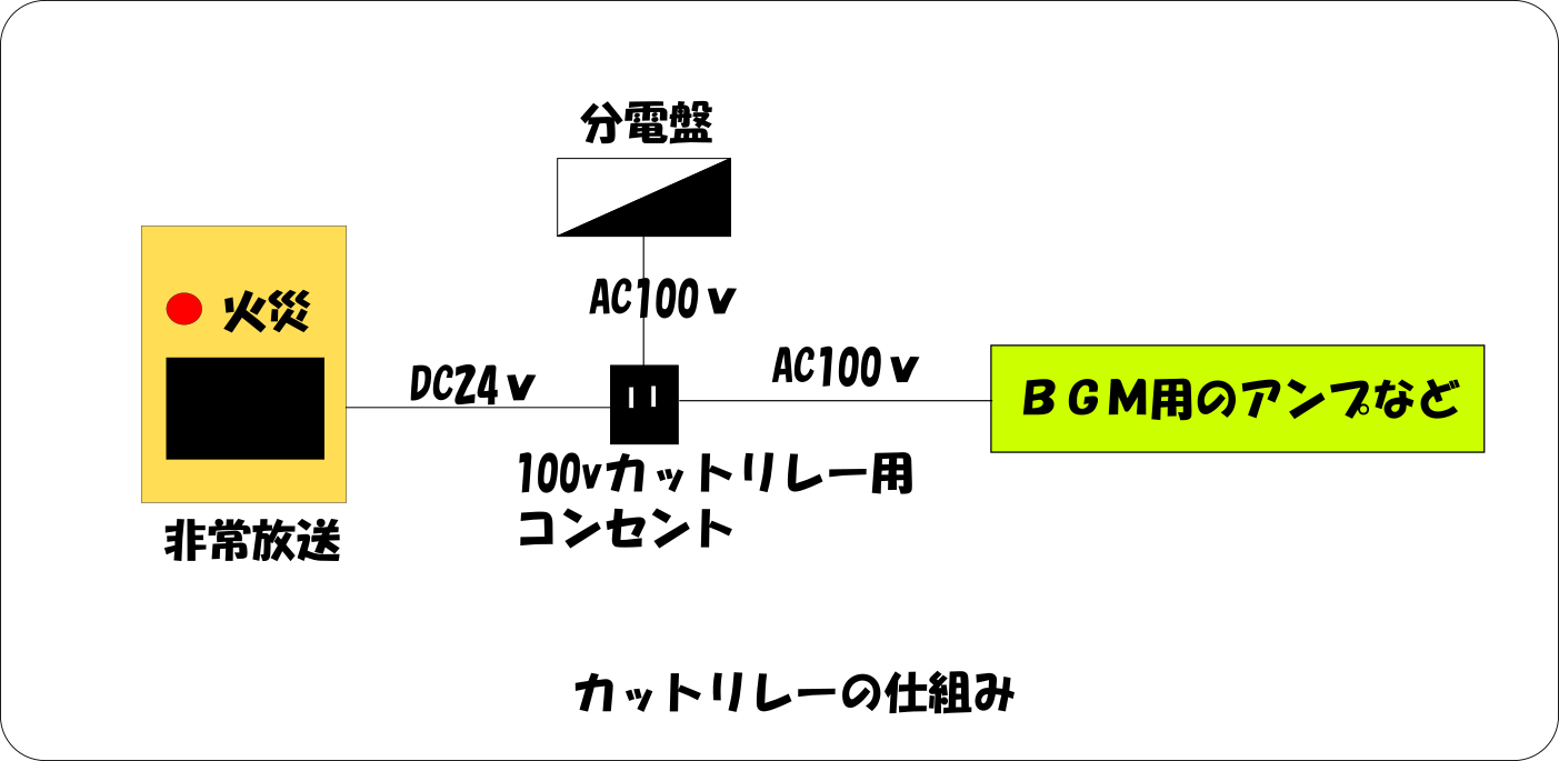 非常放送時に施設内に流れているBGMが鳴っていると非常放送の内容が聞こえにくくなります。内容を聞き取れず避難に障害があるおそれがあるため、その問題解決手段として「カットリレー」が使用されます。