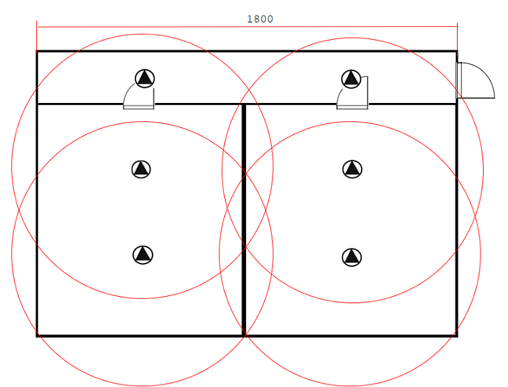 スピーカーを中心とした半径10mの円を各居室ごとに届かない場所がないように当てはめます。このように設置すれば法令に適合した正規の設置方法になります。もし居室の角がギリギリ入らない場合はスピーカーの配置を変更するか、スピーカーを1台増設して再度円がしっかりとはまるように設置する必要があります。余裕を持って設置することをおすすめいたします。
