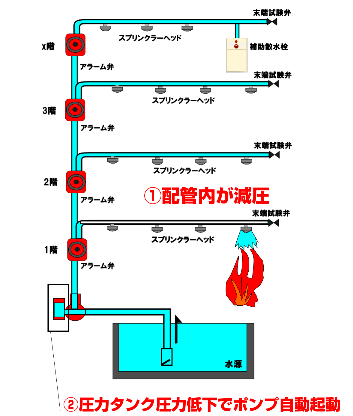 スプリンクラー設備は火災により熱を受けることによって分解したスプリンクラーヘッドから自動的に放水をすることができる設備です。スプリンクラー設備は自動消火機能を有するため合理的かつ安全に消火活動を行うことができます。