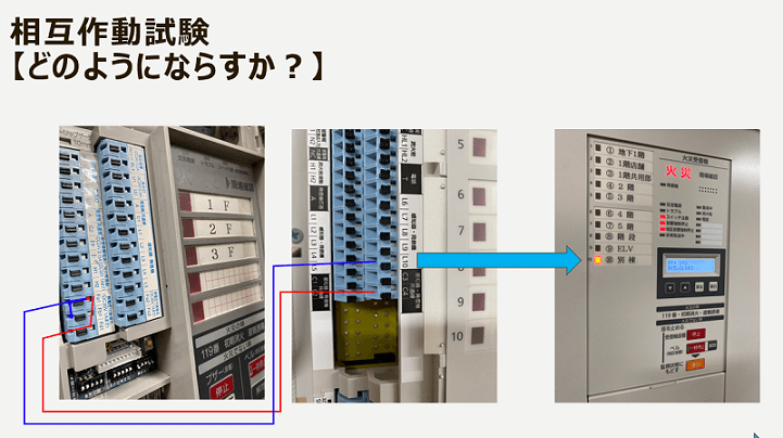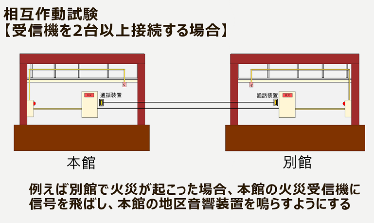 本館と別館の受信機があるとします。本館の火災感知器が作動したら当然に本館の火災受信機が働き、本館の地区音響ベルを鳴動させます。