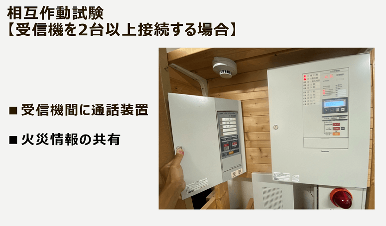 時には火災受信機を防火対象物に2台以上設置することがあります。この場合では各々の火災受信機間を結ぶ通話装置を設け、いずれの受信機から地区音響装置を確実に鳴らせることが求められます。