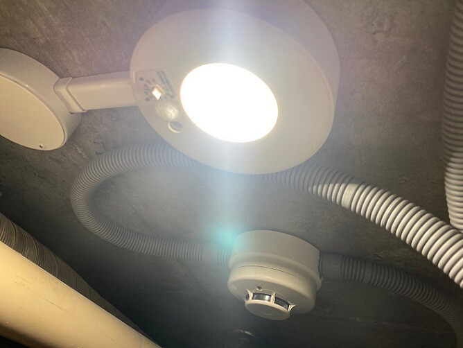 自動火災報知設備は「受信機」「総合盤」を共用設備として設置します。その共用設備から各居室や階段、エレベーターシャフト内に火災感知器類を取り付けます。先に設置しても後に設置しても最終的には接続し1つの設備として機能させることが可能なのでこのような対応を取っていただきました。