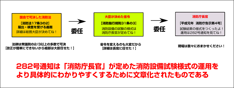 そして、この告示4号が平成14年3月に一部改正されたことにより、各種消防設備の試験については「282号通知」を基に運用するという流れになっています。このように282号通知を基にした根拠を遡ってみると消防法17条の3の2までつながっていることがわかります。