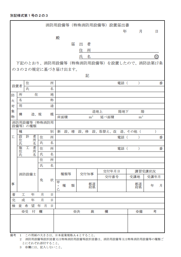 消防設備を工事する前に工事概要・設計計画を記した『着工届』を管轄消防署へ提出します。着工届は監督機関である消防署が、各種消防設備が法令通りの内容で設計されているかどうかの審査を行う資料のため、『工事に着手しようとする10日前』までに届出をしなければなりません。