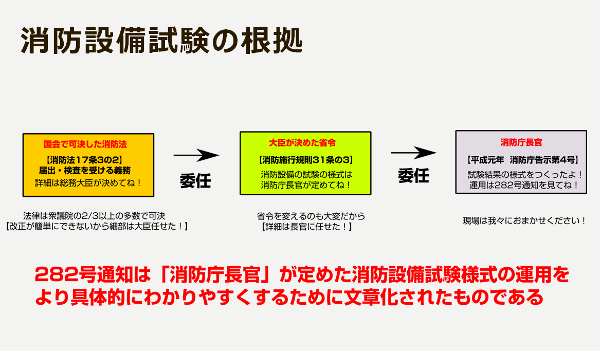 自動火災報知設備を初めとする消防設備は国会で制定された消防法に基づいて設置されます。消防法で定めた決まりの詳細を内閣(施行令)や総務大臣(施行規則)が発する命令に委任し法律の運用(設置基準など)を行っています。これらは全国共通事項として国民が守らなければならない義務です。