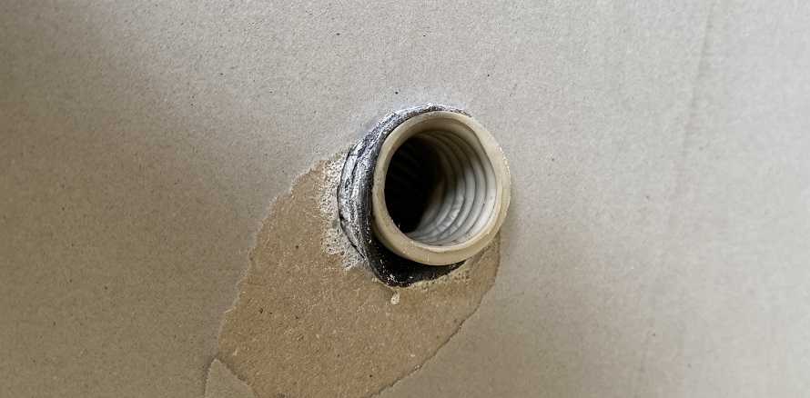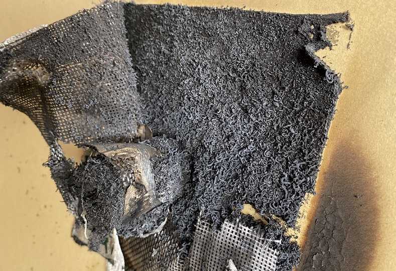 フィブロックは熱吸収し膨張していきます。PF管が溶けていますが自己消火性能があるため一切燃えることがありません。フィブロックを巻いたPF感の穴はフィブロックの膨張で完全に埋まっています。これで裏側に火が入っていくことはなくなりました。
