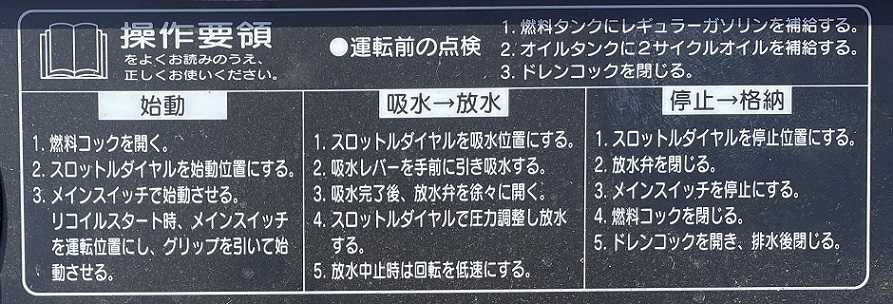 給水管、吐出ホース、ノズルの接続が完了したらポンプ本体の操作をしていきます。操作の順序は