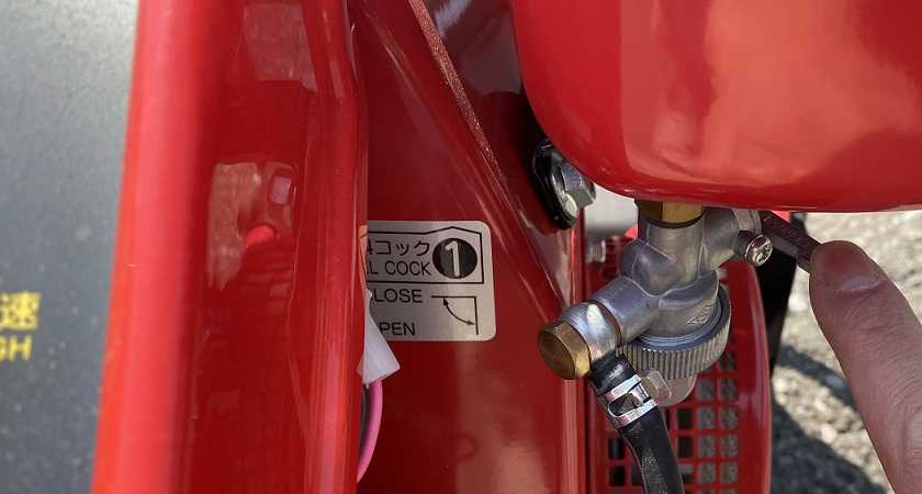 燃料コックを開きます。日頃からエンジンをかけたりする場合は燃料コックを開きっぱなしでもよいのですが、長期間使用せずに保管する場合は、保管時に燃料の供給を停止している場合がありますので、その場合には燃料コックを開放しエンジン内に燃料を送り込みます。