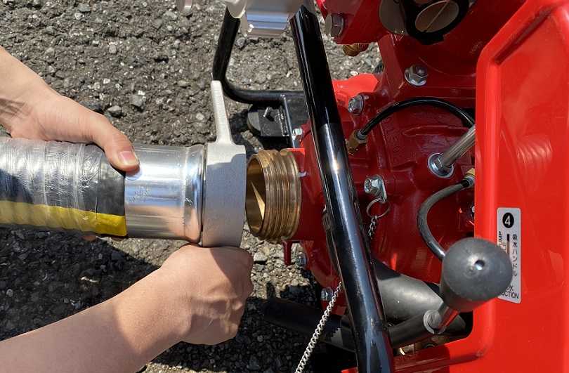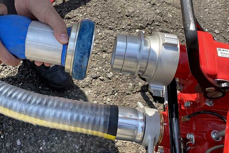 次にポンプの吐出側にホースとノズルを接続します。この接続作業が完了したら放水に必要なセッティングはOKとなります。もう一度各部分の接続を確認し漏れが無いようにチェックしていきます。