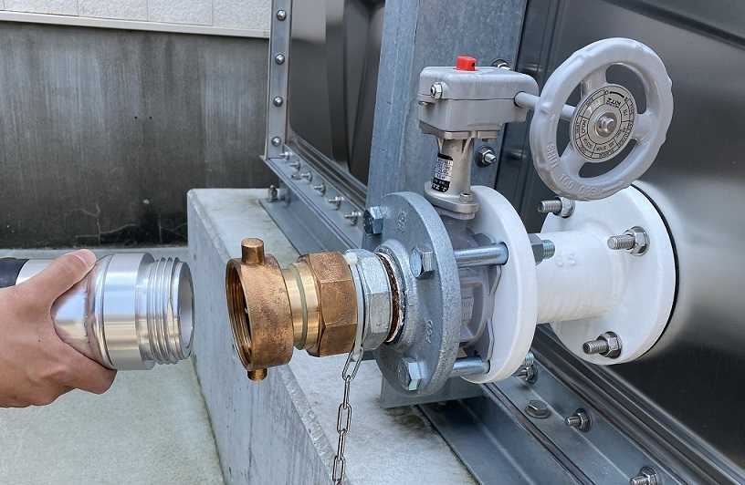 水源から消防ポンプへ給水するための水を送ります。この給水管はあらかじめ配管接続している場合がありますのでその場合はこの作業は省略となります。今回の現場はフレキシブル給水管で水源-ポンプ間を接続します。しっかりと接続しておかないと継ぎ手の隙間から水が漏れてしまうので注意が必要です。また、継ぎ手内のゴムパッキンが劣化してる場合も同様に漏れの原因となるので要チェックです。