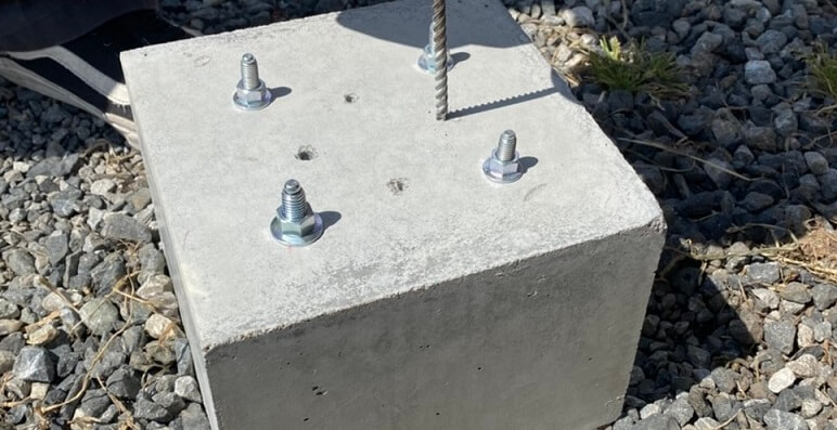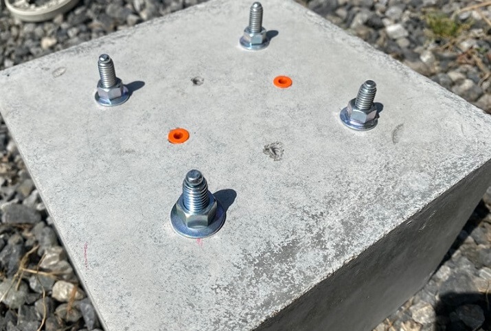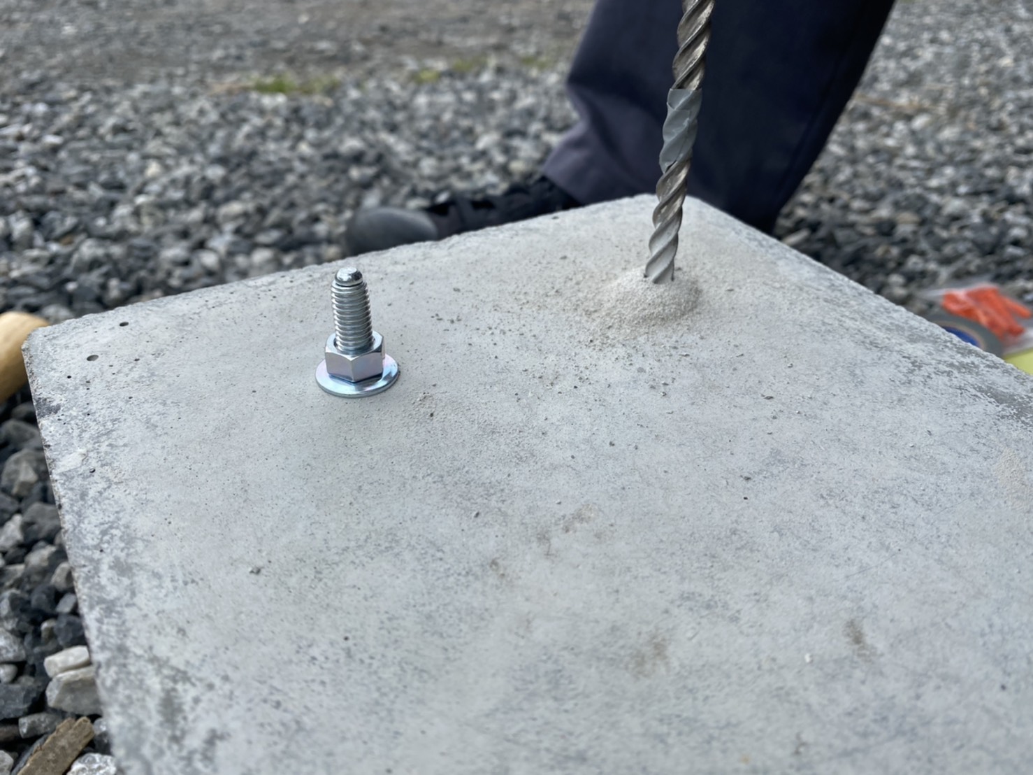 清掃後アンカー入れていきます。このアンカーは頭の飛び出している部分を打ち込むことで先端の爪が拡張してくタイプなので、この頭の丸い部分をハンマーで打ち込みます。アンカー打ちはワッシャー、ナットをつけた状態でおこないます。