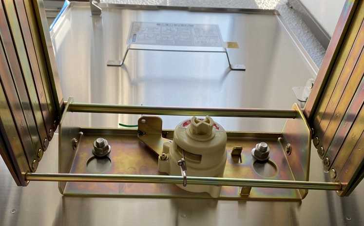 はしご本体(稼動部)を取り付けました。このパーツは避難ハッチの最も重要な部分であります。避難ハッチは中央の丸いパーツのやや左にあるレバーを下げること自動的にはしごが下に展開していく仕組みであります。このパーツはを適正な力で取り付けないと、はしご本体が脱落し落下事故が起こる場合があります。