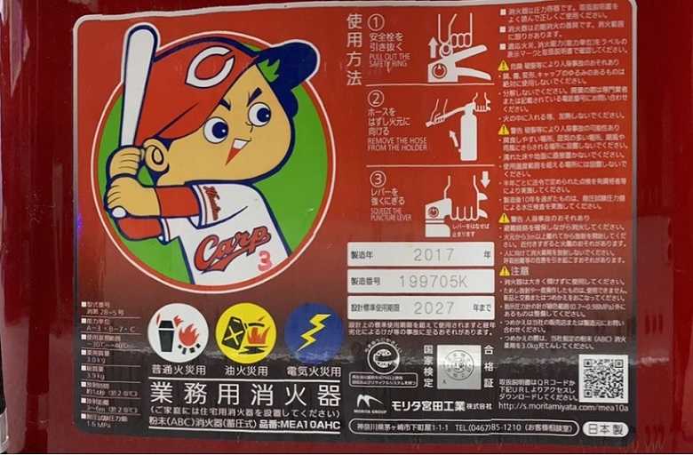 過去の話になってしまいますが、2017年広島東洋カープのV2を祈願して『カープ坊や』消火器が『モリタ宮田工業』から限定発売されました。この消火器は一般的に市中に出回っている蓄圧式の10型消火器でありますが、ラベルが変わるだけで雰囲気がガラッと変わります。消火器のカラーリングは大変美しく広島の選手のヘルメットと同じ『ソウルレッド風』メタリック調であります。