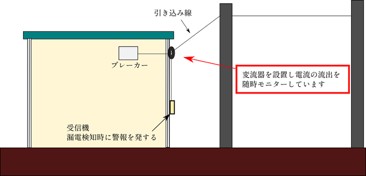 引込線の絶縁が悪く、漏電電流が壁の中のラスに流れ込んでしまった場合に、火災が発生する危険性があります。変流器を設置することにより随時引電流値をモニターし、変流器が電流値の異常を検知した場合に漏電受信機に信号を送り警報を発する仕組みです。