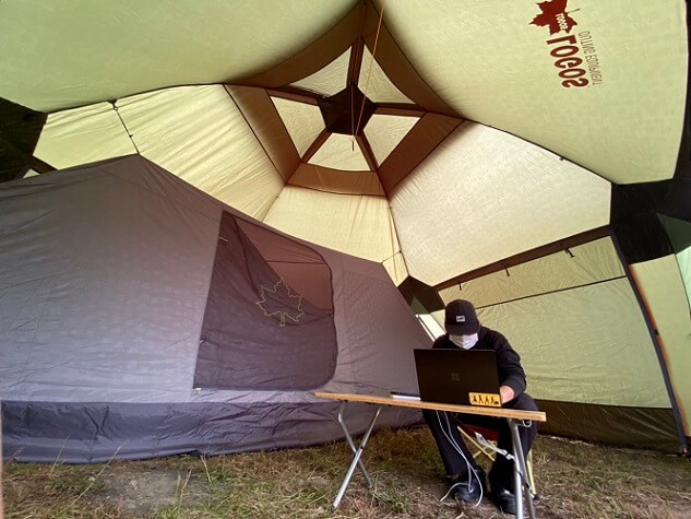ローテーブル、ローチェアを使えば天井が高くなり更に広く感じます。また、別売りですがインナーテントを設置できるのでこちらの製品もかなりおすすめです。テントは大人4人位?は寝れるかともいます。