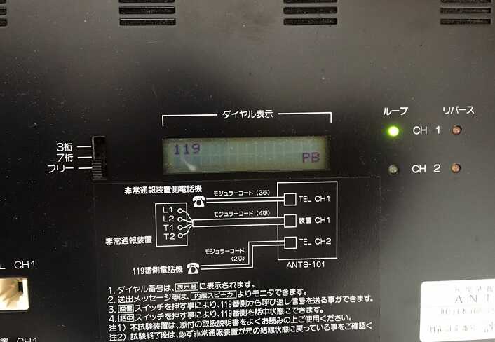 火災通報装置が作動したら自動的に119番へ通報します。今回は試験機によるシミュレーションなので、試験機側に『119』と表示され、試験機に接続されている電話が鳴ります。そのまま試験機側の受話器を取ると、火災通報装置の自動音声が流れ『部件名称』『物件住所』と続き『逆信してください』というあらかじめプログラムしてある自動音声が流れます。