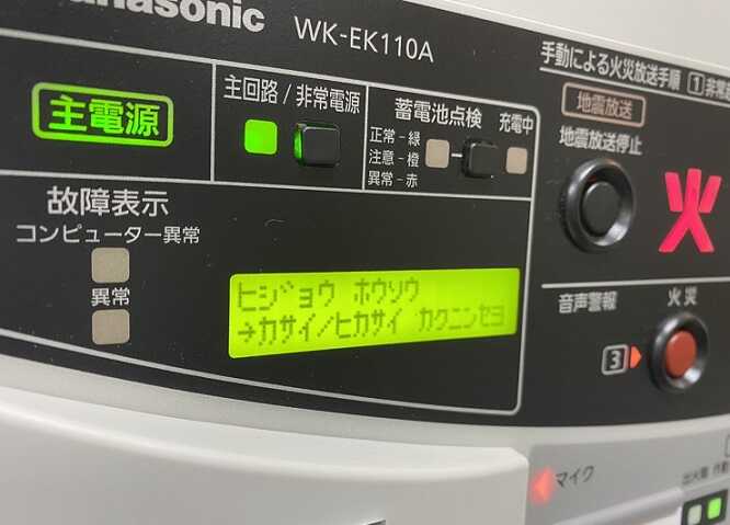 現場確認後、係員は放送アンプの『火災ボタン』『非火災ボタン』を選択します。今回は火災断定ということなので火災ボタンを押します。すると下記の内容の放送に切り替わります。