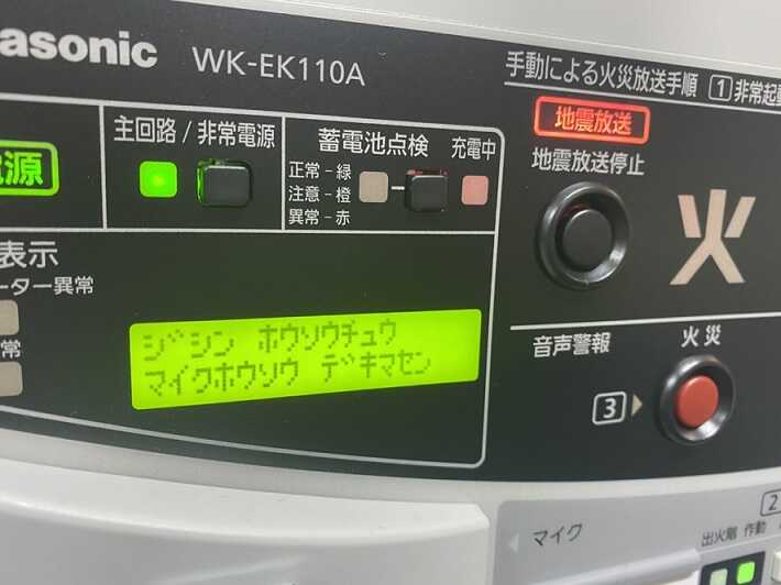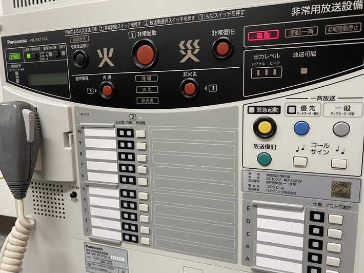 最近の非常放送は地震放送が追加されています。地震センサーが働くと非常放送設備に信号が送られ館内におなじみの不気味なチャイムと自動音声で地震放送が流れます。地震放送中はマイクの放送ができない仕様になっています。
