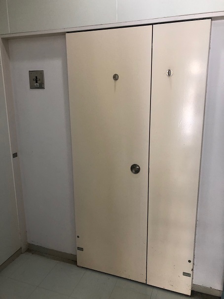 近年では画像のような防火設備を設置することはほとんどありません。遮煙を行うことが目的のため、近年では防炎スクリーンを設置することが主流になっています。煙感知器に連動して自動的に扉を塞ぎます。