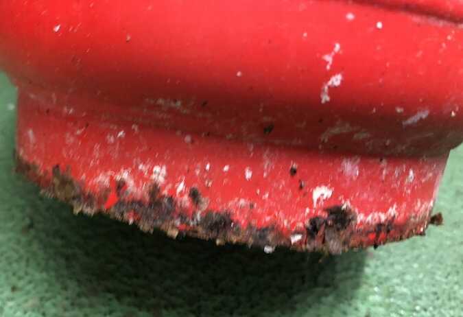 加圧式が使用されてしまった場合は、当然に容器内が空になるため『重量がなくなり』軽くなります。一般的な10型の消火器(薬剤3.0kg)はメーカーにもよりますが、『6kg』ほどの重量になっています。中身が殻になると『半分の3kg』ほどになります。またホースの先端には、粉末の薬剤が付着していることが確認できるでしょう。