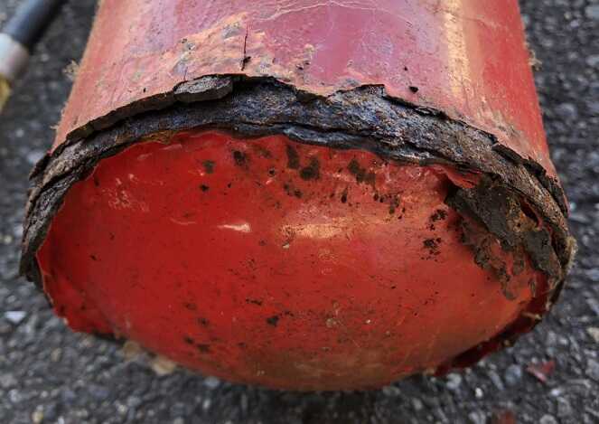 明らかに外観で腐食が確認できる消火器は即刻交換をお願いいたします。圧力ゲージが取り付けられていない『加圧式』消火器は、薬剤放出時に急激な圧力が容器内にかかり、腐食箇所が抜け落ち『ロケットのように』飛んでいきます。顎や身体に接触すると大惨事になります。実際に負傷・死亡事故が起こっていることから、直ちに適切な処置をすることが必要になります。