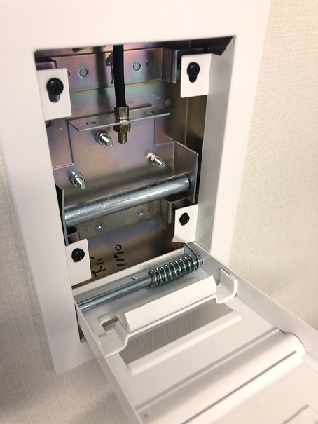 排煙オペレーターは、黒いアウターワイヤーを先行して設置した後インナーワイヤを入れていきます。アウターワイヤーが緩やかな曲線で設置されていればインナーワイヤーは軽い力でも簡単に入っていきます。ワイヤーを張ったらオペレーターにしっかりと固定すれば通常の警戒状態になります。