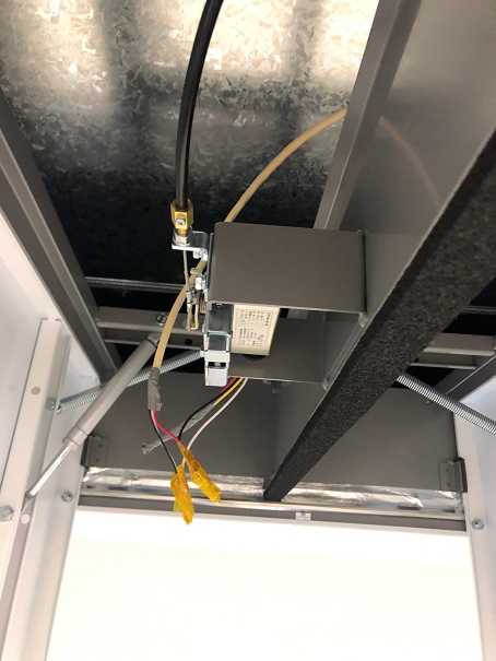 配線引いたらアウターワイヤーを入れ込みます。このワイヤーは自電車のブレーキと同じ仕組みで、排煙口を開ける際、インナーワイヤを引張るためのガイドワイヤです。アウターのカーブが急角度になっている場合はインナーワイヤーに摩擦が生じ容易に排煙口を展開させることができなくなるので緩やかな曲線を描くように設置する必要があります。