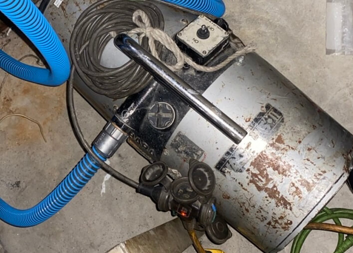 工事をするには配管内の水を抜かなければなりません。水抜き作業はこのバルブで行います。メインバルブを閉めドレンバルブを開放して水を抜いていきます。ただこのままでは抜けきれないのでバキュームポンプを使用します。この装置を使用し配管内の水をバキュームします。