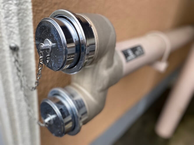 連結送水管は配管を使用しポンプ車から水を送り込むことで消火活動を行います。水を送る側を「送水口」、消火活動を行う側を「送水口」といいます。