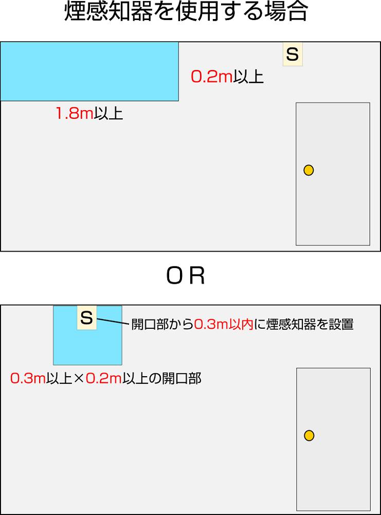 ・間仕切り上部に0.3m以上✕0.2m以上の開口部を空け、その開口部から0.3m以内に煙感知器を取り付ける