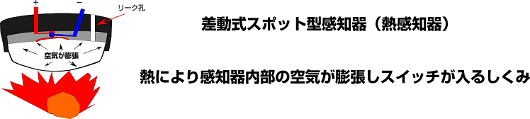経年劣化で誤作動が起こりやすい感知器は熱感知器【差動式スポット型・空気管型】です。この2つの熱感知器は熱による空気の膨張を利用した仕組みになっています。熱を加えると空気室内部が膨張し、温度が下がったらもとに戻るしくみです。空気管型も同じ方式の熱感知原理です。