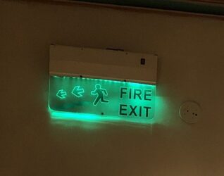 誘導灯は多種多様なものでした。海外では緑ベースのものが一般的に使用されてまれに赤文字という認識をしていましたが、透明地に白表示は初めてみました。デザイン的には斬新でかっこよさはありますが、果たして火災時に誘導灯として認識できるのかは不明です。