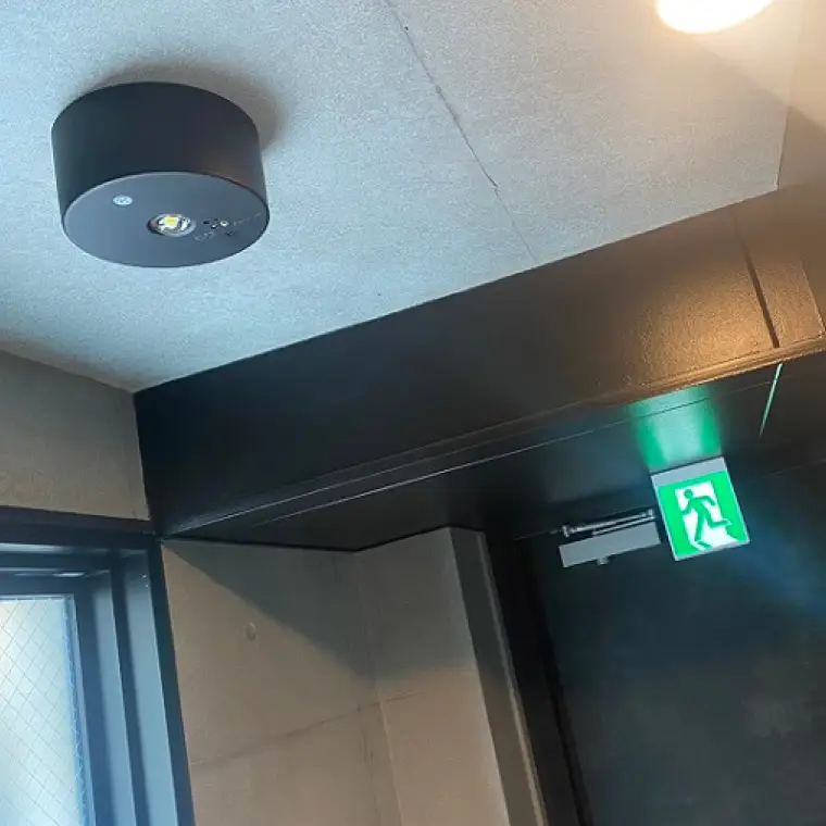 災害時の避難を助ける照明設備。停電時でも点灯し、避難経路を明示する役割を担います。