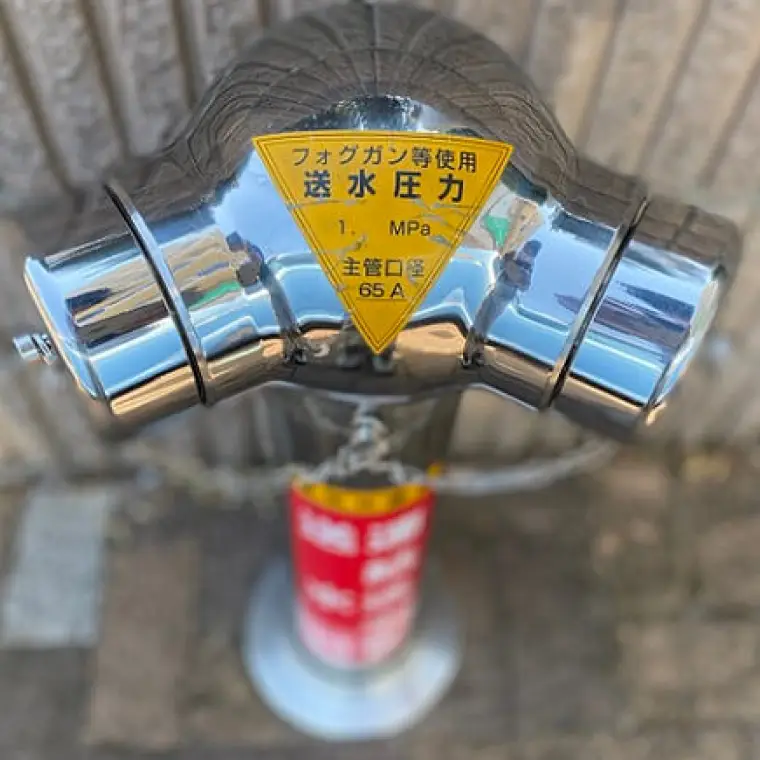 高層建物などで、消防隊が消火用水を迅速に供給するための設備。外部から消防ホースを接続し、建物内部へ送水します。
