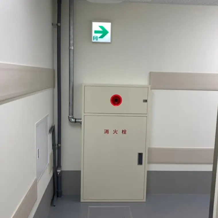 建物内部に設置され、火災初期に使用できる消火設備。消火栓ボックス内にホースとノズルが格納されています。